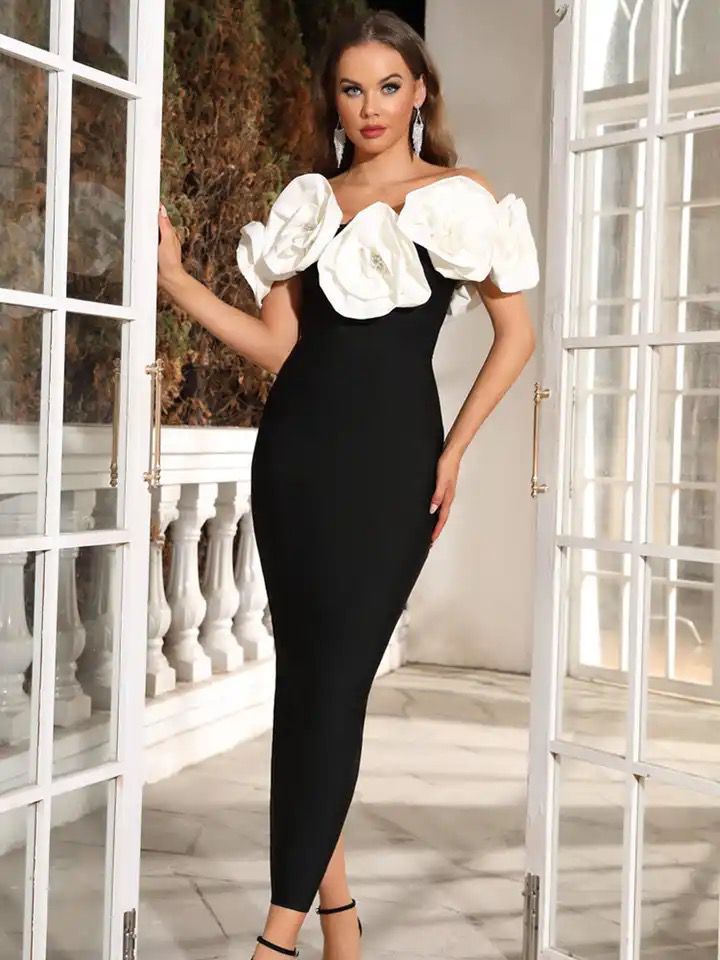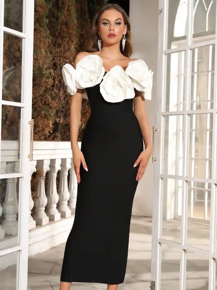 ROBE COCKTAIL BANDAGE AVEC DÉCO ROSE